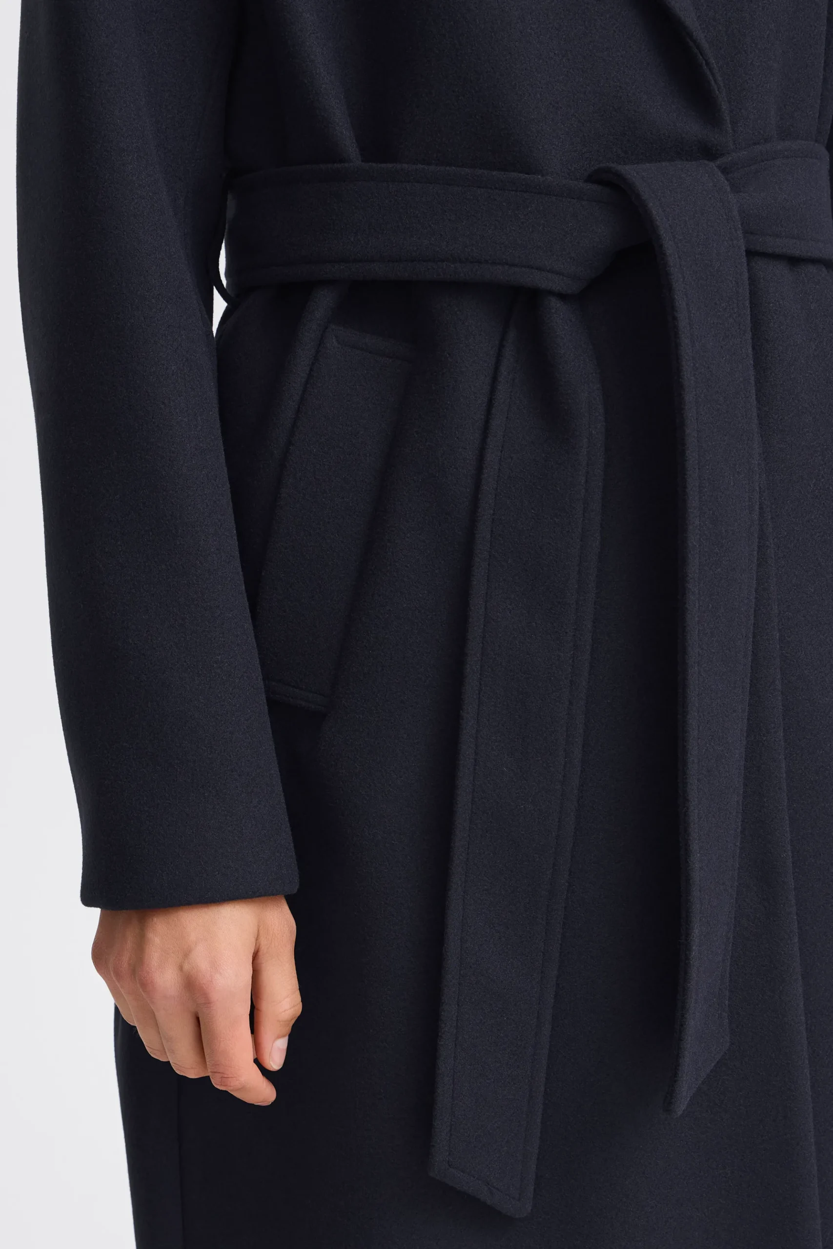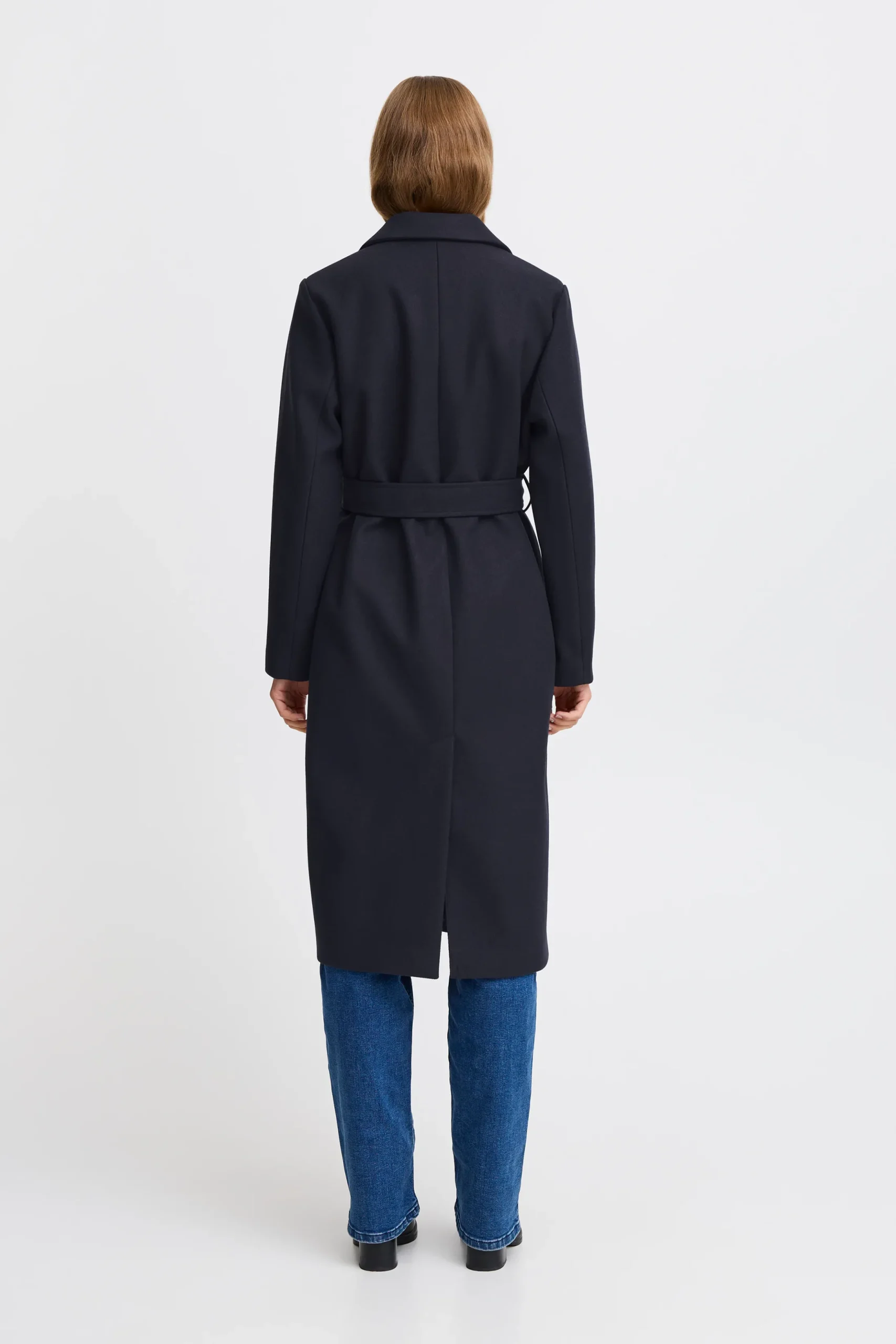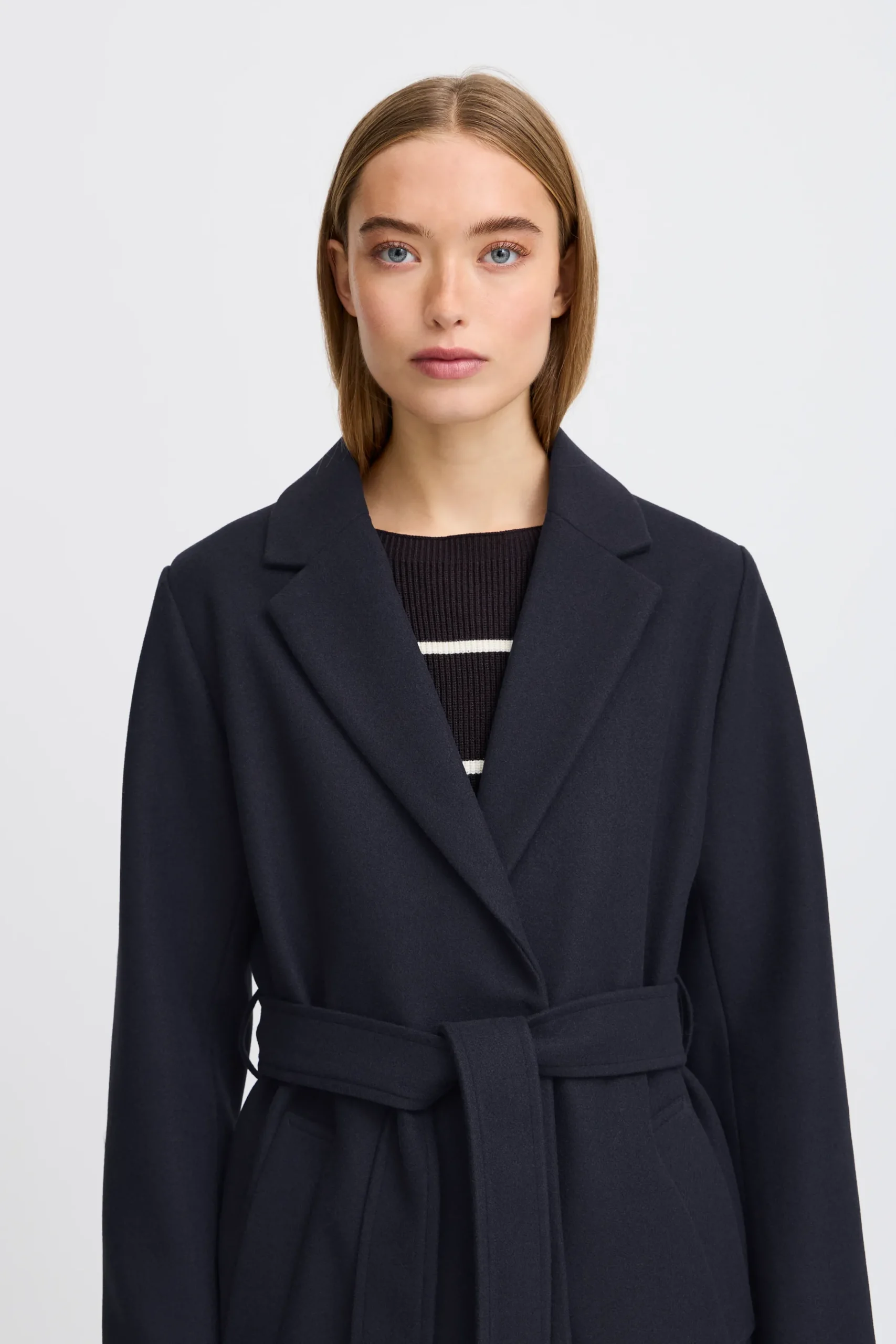 This coat combines a comfortable fit with an elegant silhouette. The wide collar and the waist tie create a feminine and sophisticated look that can easily be styled for both everyday wear and formal occasions.